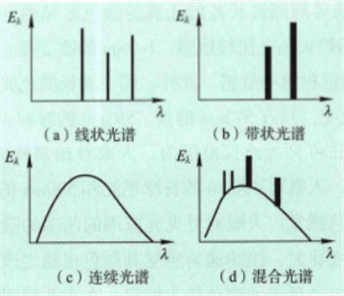 線狀光譜是由若干條明顯分隔的細線組成,如低壓鈉燈發(fā)出的光線就是由波長為589.0nm和589.6nm的兩條黃色光線構成的。帶狀光譜是由一些分開的譜帶構成,每個譜帶又包含許多緊靠的譜線,如碳弧和高壓汞燈就屬于這種分布。連續(xù)光譜包含一定范圍內所有波長的輻射譜線,且能量隨波長平滑變化,所有熱輻射光源都屬于這種情況,如日光和白熾燈光等,這是光源中常見的一種分布?;旌瞎庾V是前述光譜的組合,日常生活中常用熒光燈就屬于這種分布。