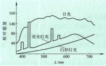 上圖為常見光源的光譜能量分布曲線。白熾燈在長波的紅色段相對輻射能量高,因而看上去顏色偏紅;而熒光燈在藍、綠色波段相對輻射能量較高,紅色波段的相對輻射能量較低,因而看上去呈藍白;日光光譜則相對比較均衡,在可見光范圍內能量起伏不大。