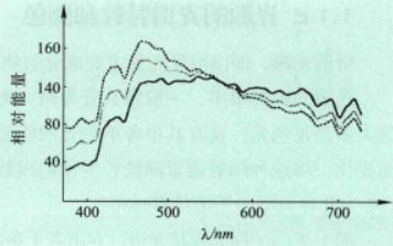 日光的光譜沒有人造光譜光源穩(wěn)定,不同氣候下、不同時間,它的相對光譜功率分布曲線的形狀是不同的。這就是為什么早晚看到的是紅霞,正午看到的是通常所說的白光。不同時相的日光光譜功率分布如下: